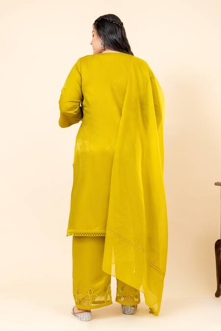 Dark lime green kurta featuring intricate embroidery and a round neckline. Paired with matching pants and a lightweight dupatta.