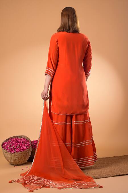 Orange kurta featuring intricate embroidery and a round neckline. Paired with matching pant and a lightweight dupatta adorned with tassels.