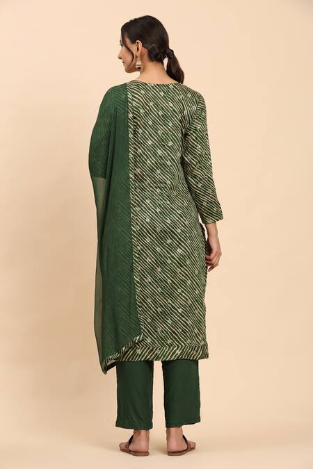 Green kurta featuring diagonal stripe print, floral butti print, and embroidery details. Paired with a matching palazzo and dupatta.