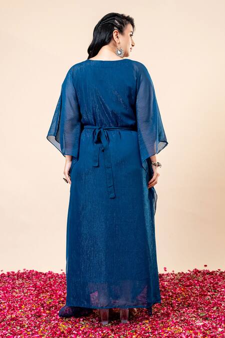 Teal Chiffon Beads V-neck Draped Kaftan With Belt
