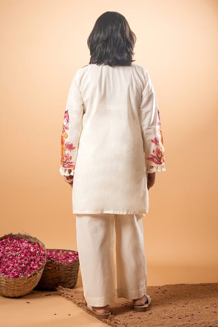 Off-white kurta featuring vibrant embroidery on the neckline and sleeves. Paired with matching off-white pants with intricate detailing.