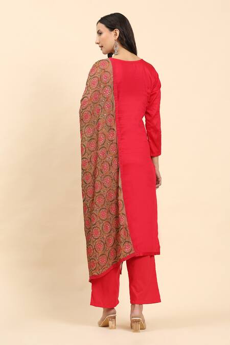 Red kurta featuring floral embroidery along the placket. Paired with a matching palazzo and dupatta.