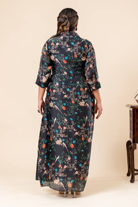 Floral print design throughout the fabric, Wrap style with a tie belt, Three-quarter sleeves for added elegance