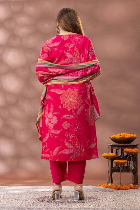 Pink kurta featuring intricate floral patterns and a keyhole neckline. Paired with matching pants and a dupatta with colorful striped borders.