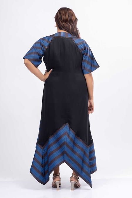 Decorative striped patterns on sleeves and hem, Asymmetrical hem design, V-neckline with intricate detailing