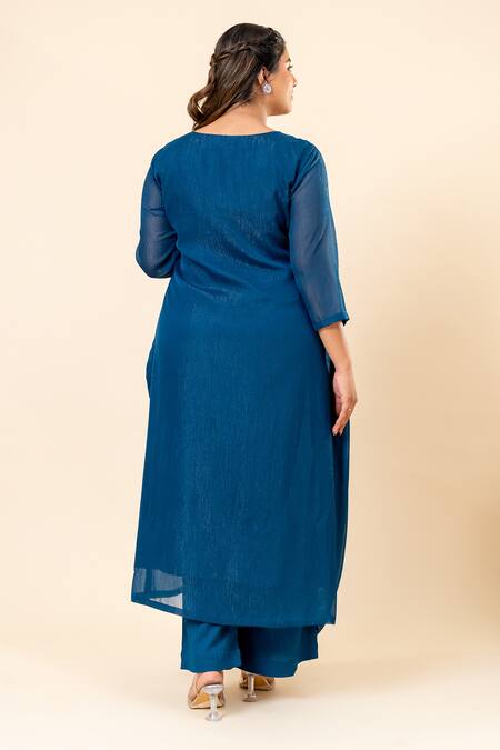 Midnight blue kurta featuring flat shimmer chiffon fabric with intricate embroidery. Paired with matching pants for a complete look.