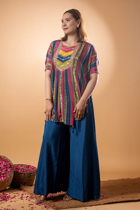 Multicolor kurta featuring intricate patterns and embellishments. Paired with matching blue pants in a flowy design.