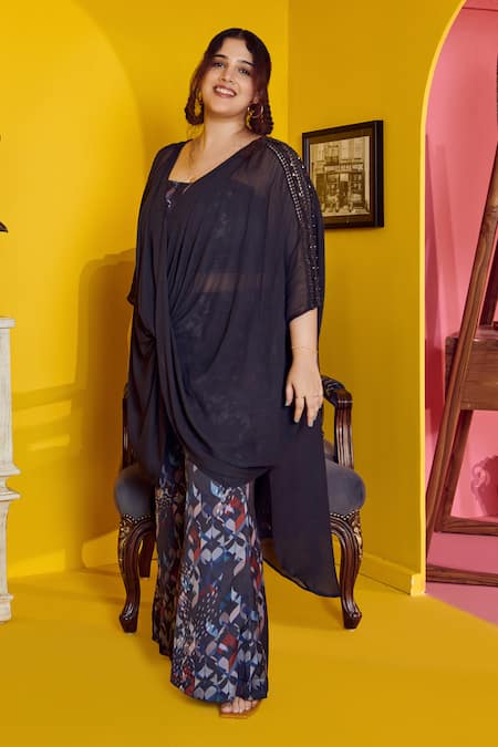 Black satin crepe co-ord set featuring an attached inner lining. Includes a tunic and pant with a unique design.