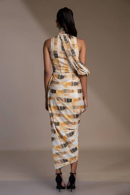Yellow draped dress featuring a wrap-around neckline and abstract patterns