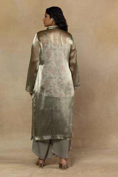 Moss green short kurta featuring floral print and paired with a matching pant. Accompanied by a sheer shrug with mirror embroidery on the neckline.