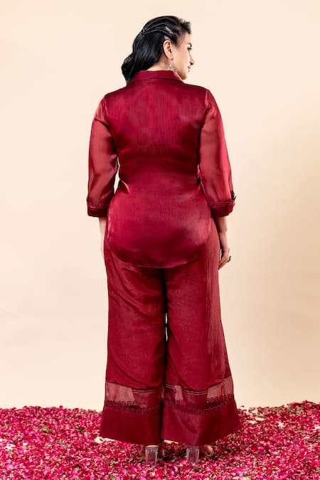 Rose wood kurta in organza chiffon featuring intricate floral embroidery. Paired with matching wide-leg pants for a cohesive look.