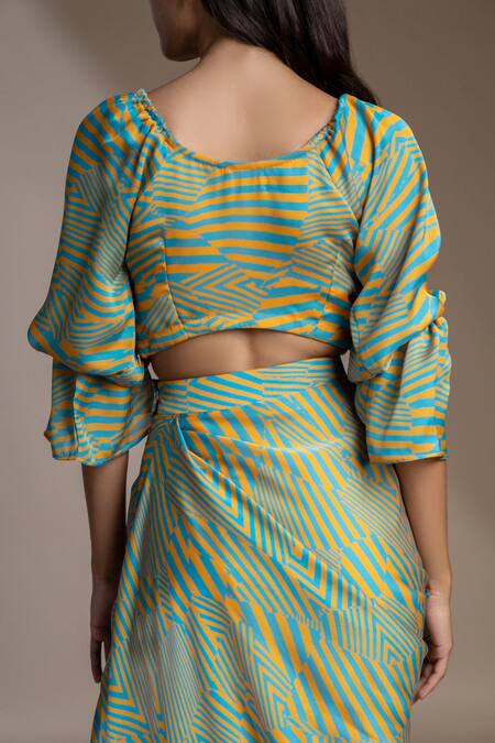 Blue Satin, Georgette V-neck Stripe Print Crop Top