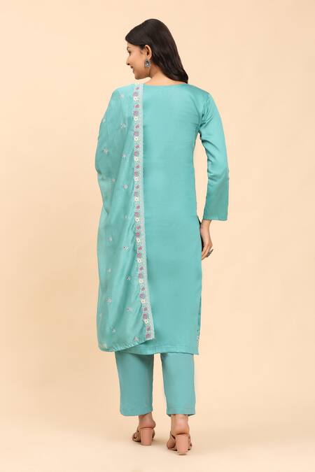 Sea green kurta featuring thread and bead embroidery on the yoke and hem. Paired with a matching palazzo and dupatta.