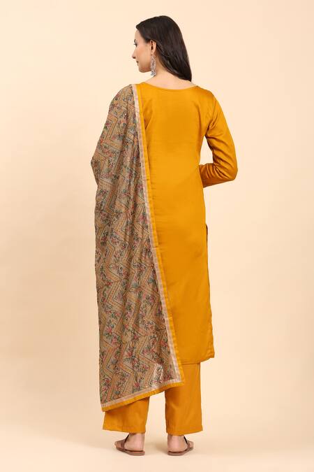 Mustard yellow kurta featuring sequin and thread embroidery on the placket and hem. Paired with coordinating palazzo and dupatta.