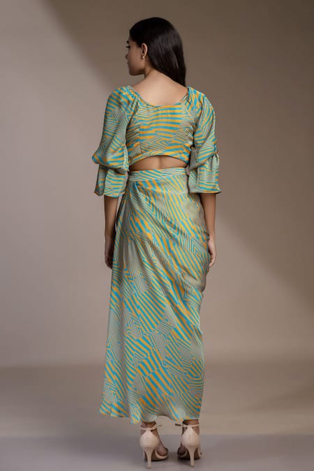 Turquoise stripe print crop top featuring a front twist pattern and off-shoulder neckline. Paired with a matching draped skirt with elasticated details and attached lining.