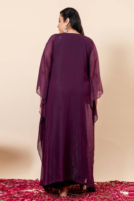 Wine flat shimmer chiffon kaftan featuring intricate embroidery and a deep V-neckline. Paired with matching pants for a complete look.
