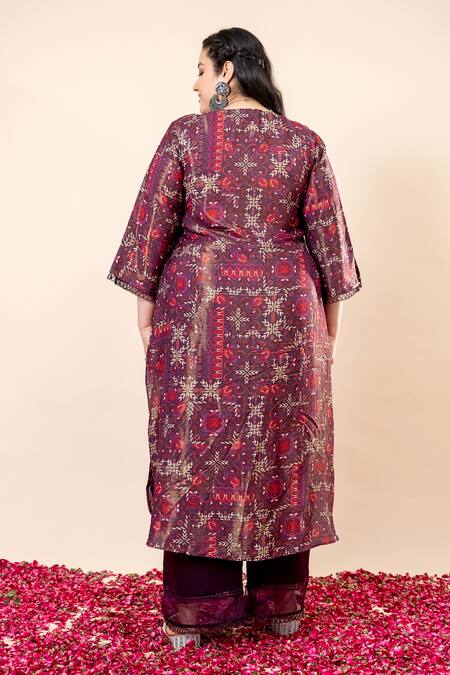 Wine kurta featuring intricate floral and geometric prints. Paired with matching wine pants for a coordinated look.