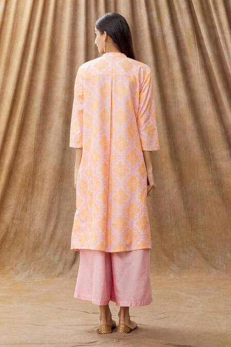 Peach silk chanderi kurta with geometric thread embroidery. Comes with palazzo.