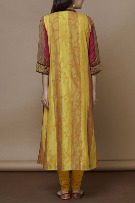 Multi color flared kurta with placement floral motif prints. Comes with embroidered dupatta & plain churidar.