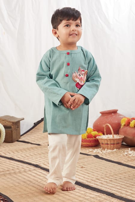 Blue kurta featuring Ganpati placement embroidery and a mandarin collar. Paired with a contrast pant for a complete look.