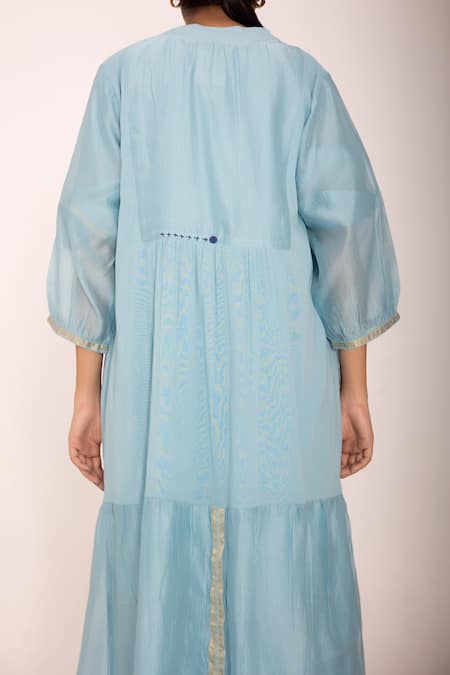 Blue midi dress with mandarin collar, gathers on the waistline and gold brocade tribal border on sleeve hems.