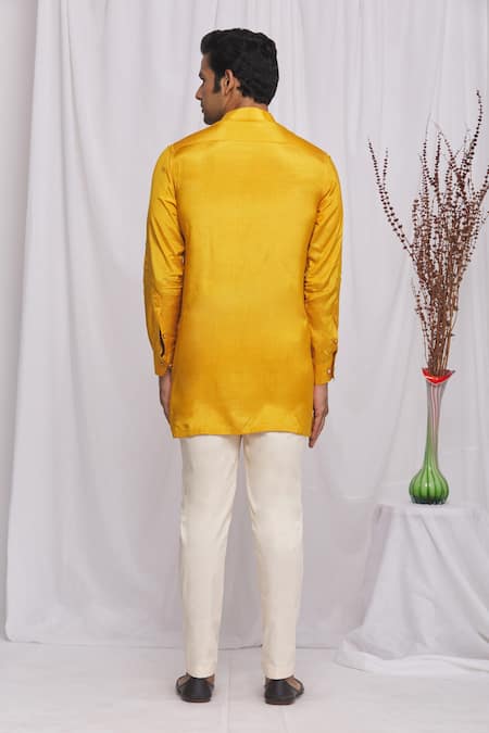 Buy_Ekam By Manish_Yellow Semi Silk Plain Mandarin Collar Shirt_Online_at_Aza_Fashions