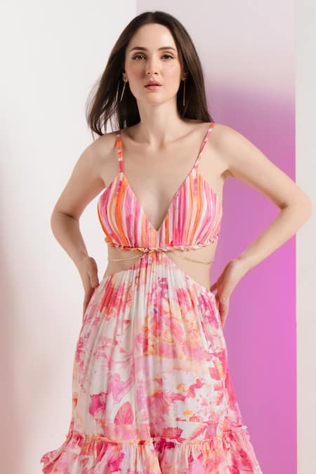 Multicolored pink maxi dress featuring a plunging V neckline and cutout at the waist