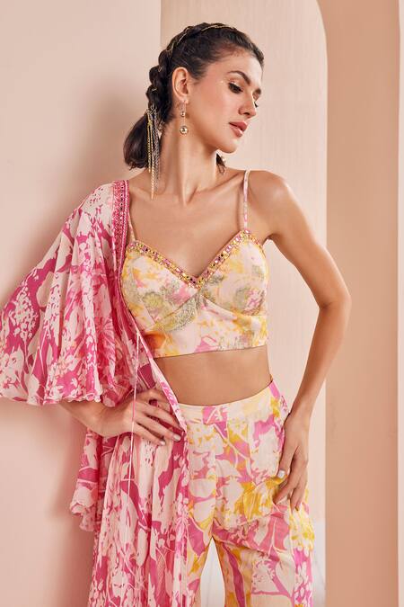 Pink sharara set featuring floral prints and a V-neck blouse. Includes a chiffon cape adorned with mirror tassels.