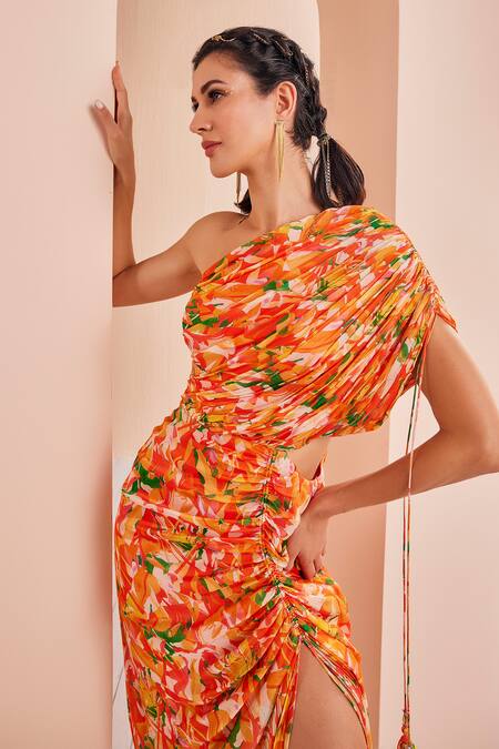 Orange mesh chiffon ruched and draped one-shoulder dress featuring an abstract print