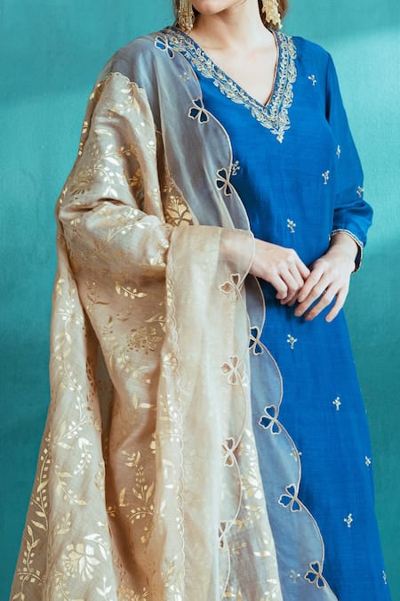Blue chanderi floral embroidered kurta with V neck. Comes with chanderi embroidered sharara, beige embroidered foil printed dupatta and inner slip.