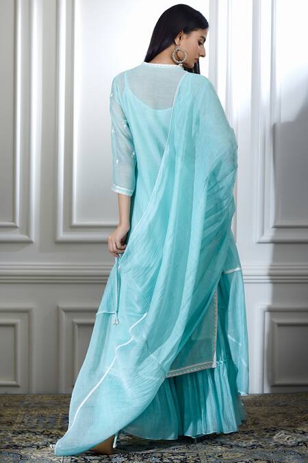 Aqua blue kurta with all-over floral motif work paired with tiered sharara. This set comes with tassel border dupatta & inner.