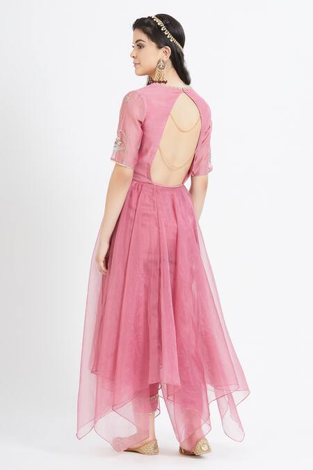 Pink Organza, Chanderi V Neck Asymmetric Kurta Set