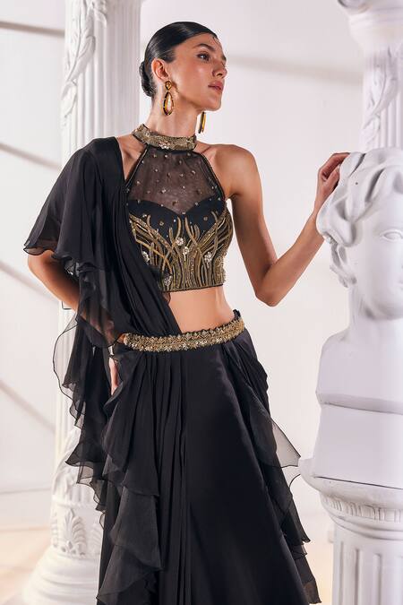 Black chiffon pre-draped saree featuring ruffle details. Paired with a sequin, cutdana, and bead embellished corset along with an embroidered belt.