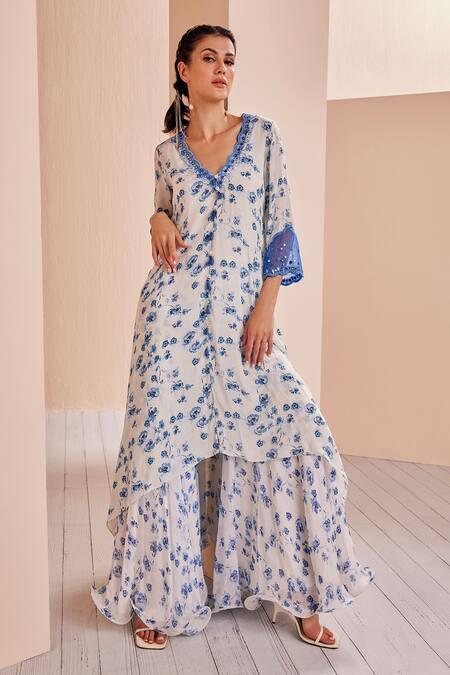 Blue floral printed crepe A-line kurta featuring a V neckline and three-quarter sleeves. Paired with a printed paneled sharara with a wired pico-finished hem.