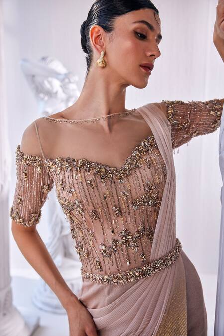 Peach and gold pre-draped saree gown featuring intricate bead and sequin work