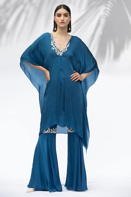 Sapphire blue kaftan tunic with placement sequin-bead work, inverted pleat & uneven hem. Comes with gharara pants.