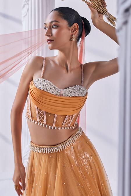 Peach Satin, Georgette, Net Pearls Sweetheart Ombre Embellished Lehenga Set
