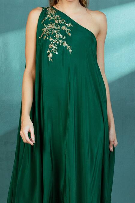 Emerald Green Kaftancrepe Pant Lurex Floral One Shoulder Kaftan And Set