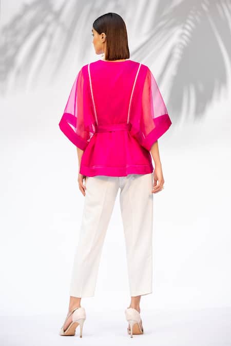 Hot pink organza peplum top with placement floral motif work & sheer panel. Comes with ivory pants & satin belt.
