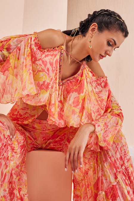 Red floral printed kurta featuring a V-neckline and layered ruffle sleeves. Paired with a tiered sharara in chiffon fabric, showcasing an embroidered design.