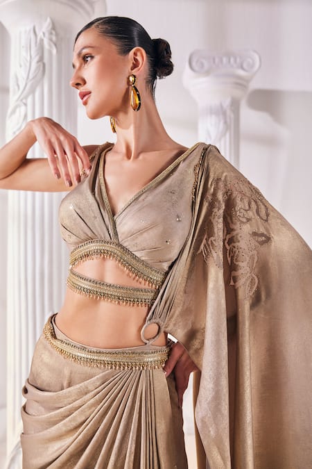 Metallic antique gold pre-draped saree featuring intricate embroidery and tassel details. Paired with a luxurious metallic embroidered blouse with a cutout and tassel details, along with an embroidered tasseled belt.