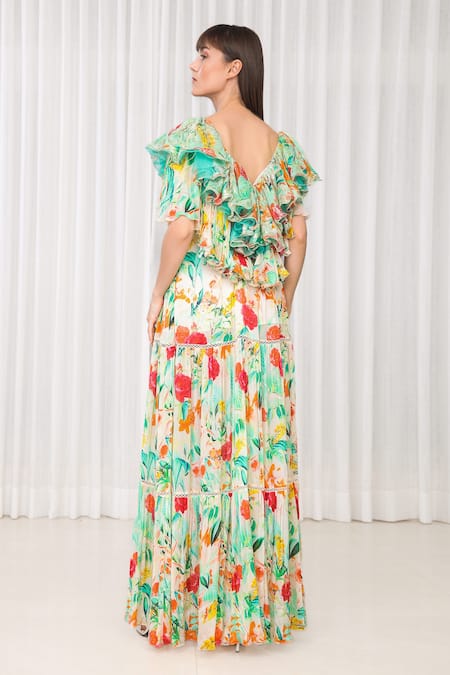 Organza ruffled sleeves with layered detailing, Front slit design for added flair, Dahila bouquet prints throughout the dress