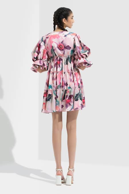 Multicolored tiered dress with all-over abstract print, plunging neckline and frilled hem sleeves.
