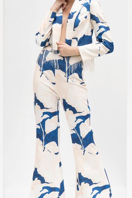 Blue texture printed jacket featuring lapel neckline, full straight sleeves, and hand embroidered tassels along the hemline. Paired with high-waisted flared hem pant.