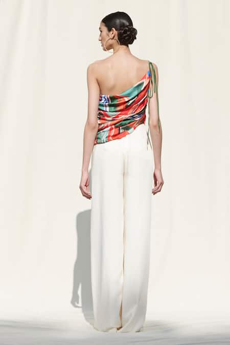 Multi Color Crepe Satin One Shoulder Draped Top And Pant Set