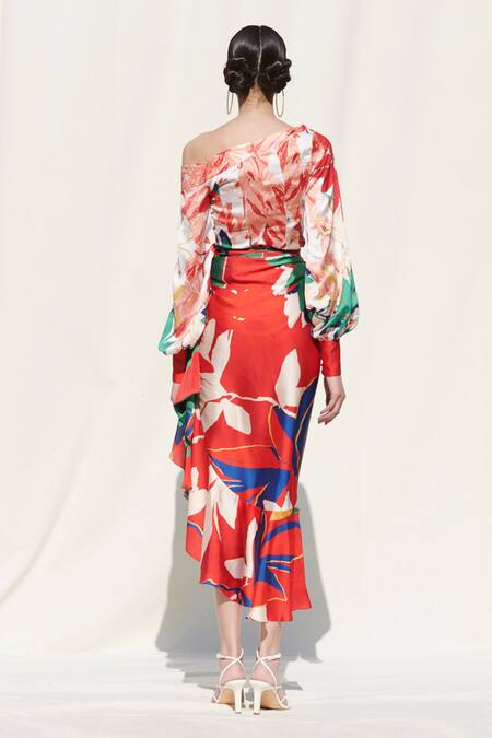 Red one-shoulder panelled top with bishop cuff sleeves. Comes with wrap- around skirt enhanced with floral motif prints.