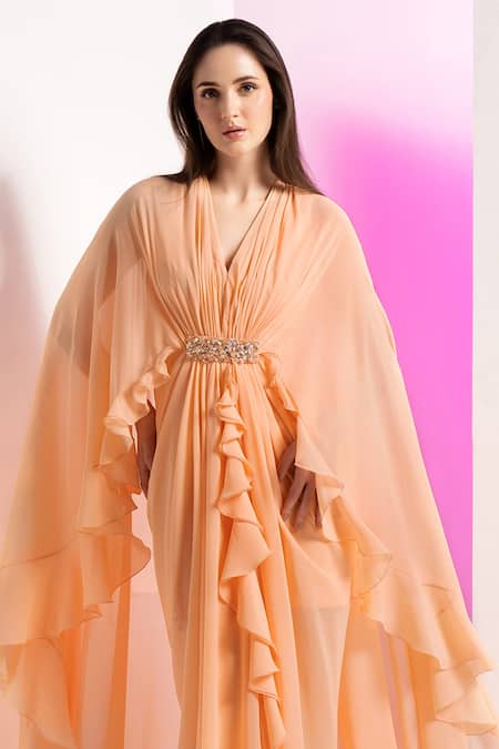 Peach Georgette Sequins, Beads, Stones V-neck Pleated Draped Cape Sleeve Dress