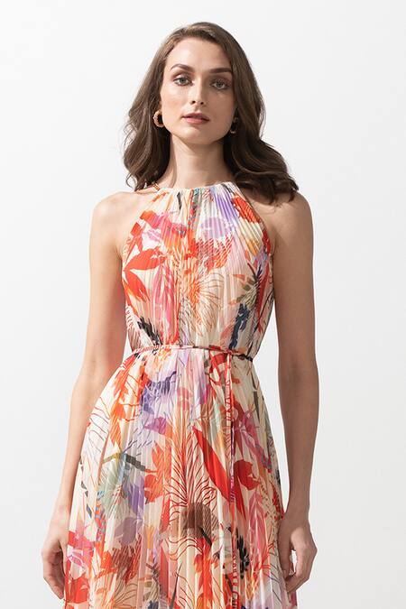 Orange, multi colored georgette dress with floral print, pleated silhouette, asymmetric hem & chain detailed neckline.