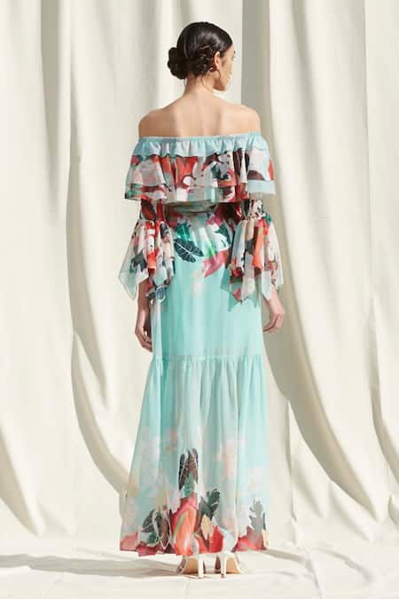 Green flared off-shoulder maxi dress with floral printed motifs, smocked detail & asymmetric handkerchief sleeves.