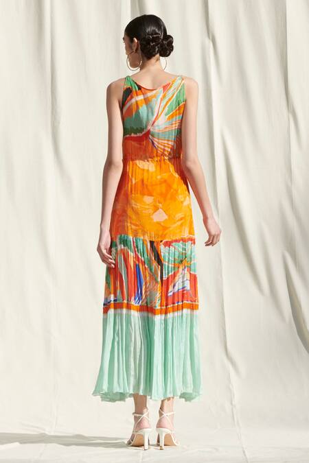Yellow & green flared dress with gathered tiers, placement printed motifs & tassel tie-up front.